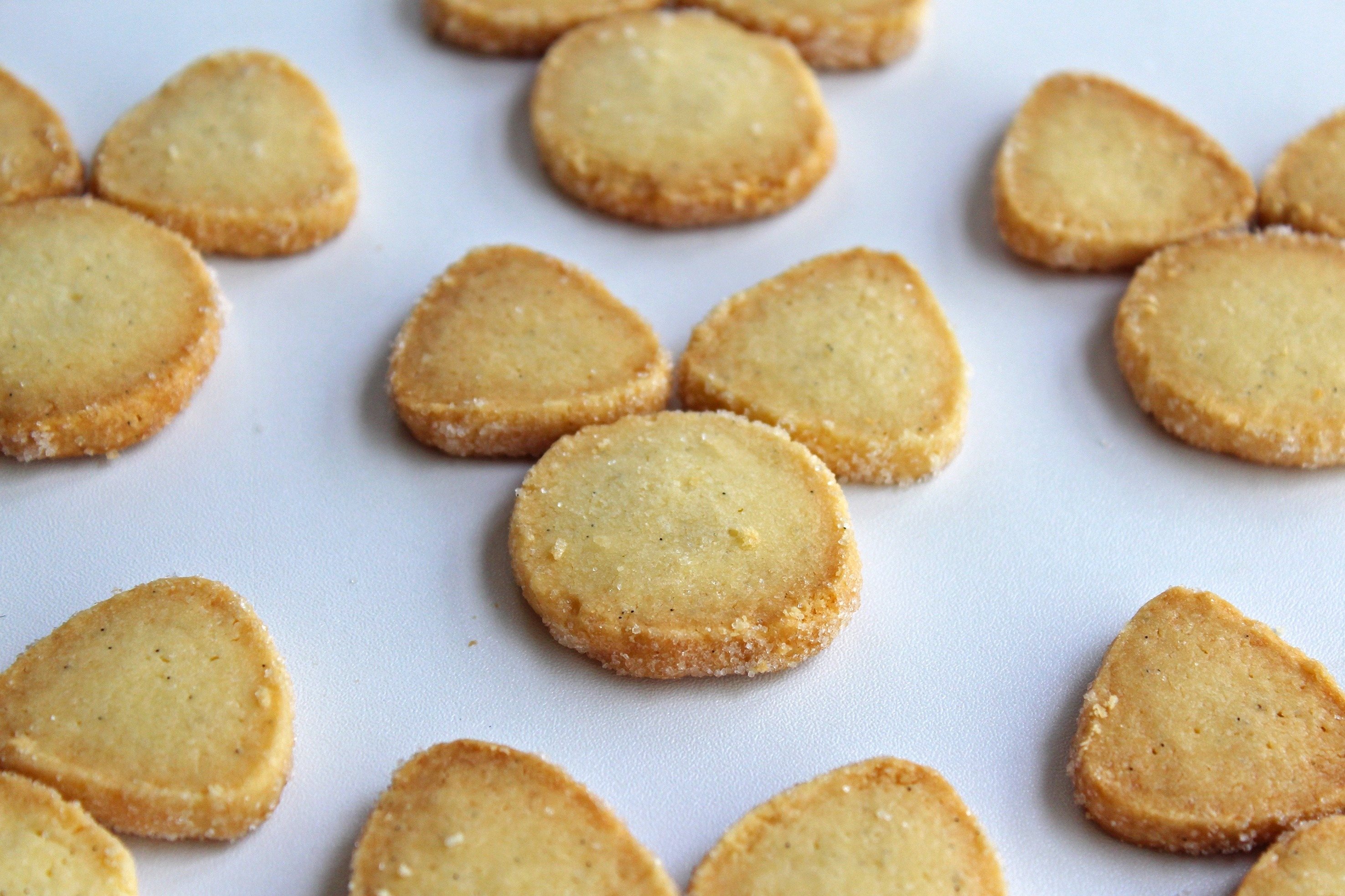 5、烤箱预热170℃,取出面团,表面裹上砂糖粒,切成薄厚均匀的饼干片;