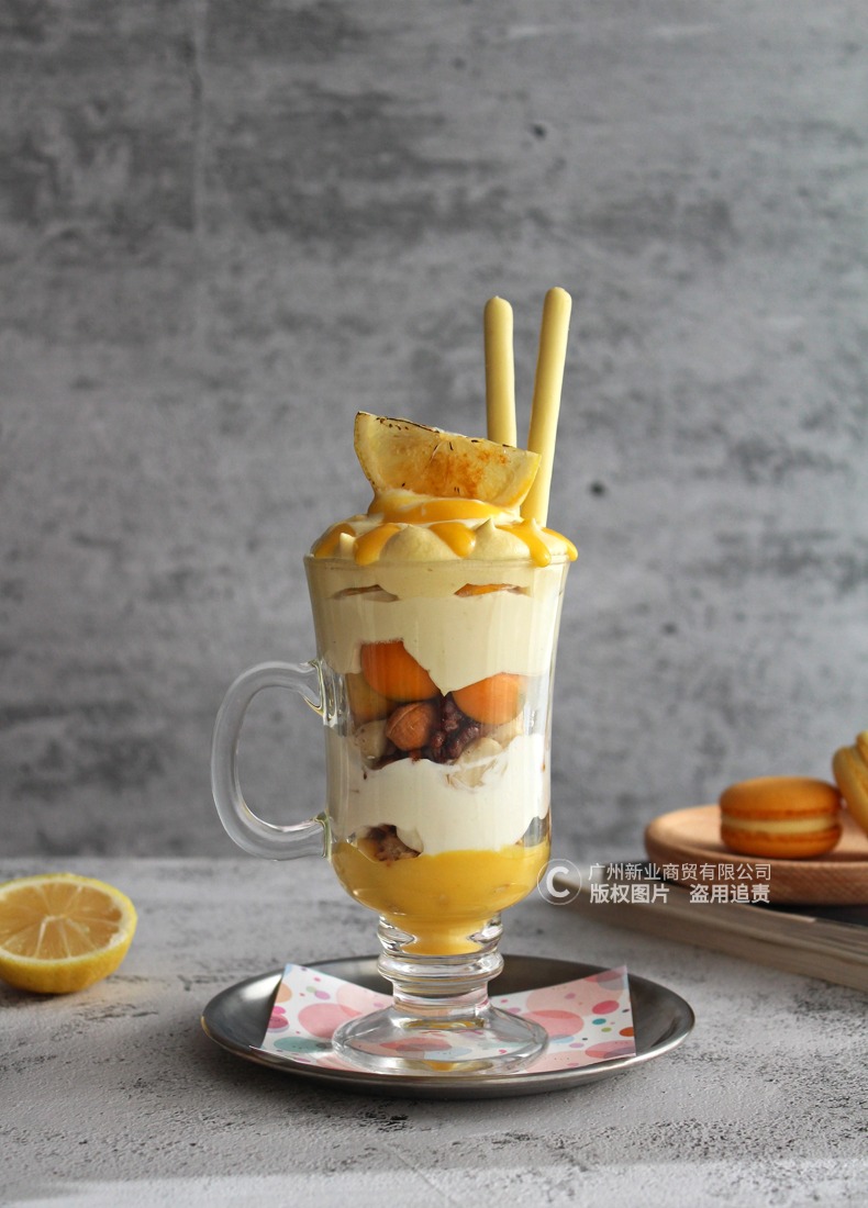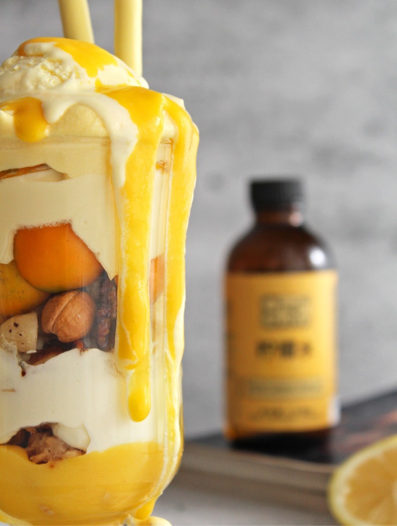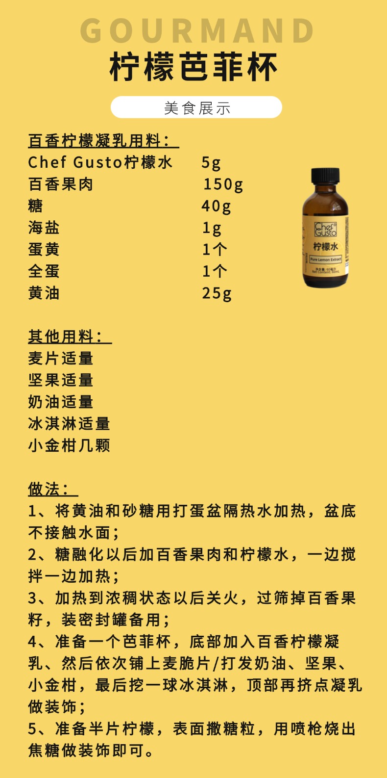 这款柠檬百香芭菲杯,以Chef Gusto柠檬水为灵魂,搭配百香果肉、糖、海盐等熬制出酸甜凝乳,再与麦片、坚果、奶油、冰淇淋、小金柑分层堆叠。每口都迸发柠檬的清新与百香果的果香,酸甜层次交织,是视觉与味觉的双重治愈,让夏日甜品充满活力与惊喜。