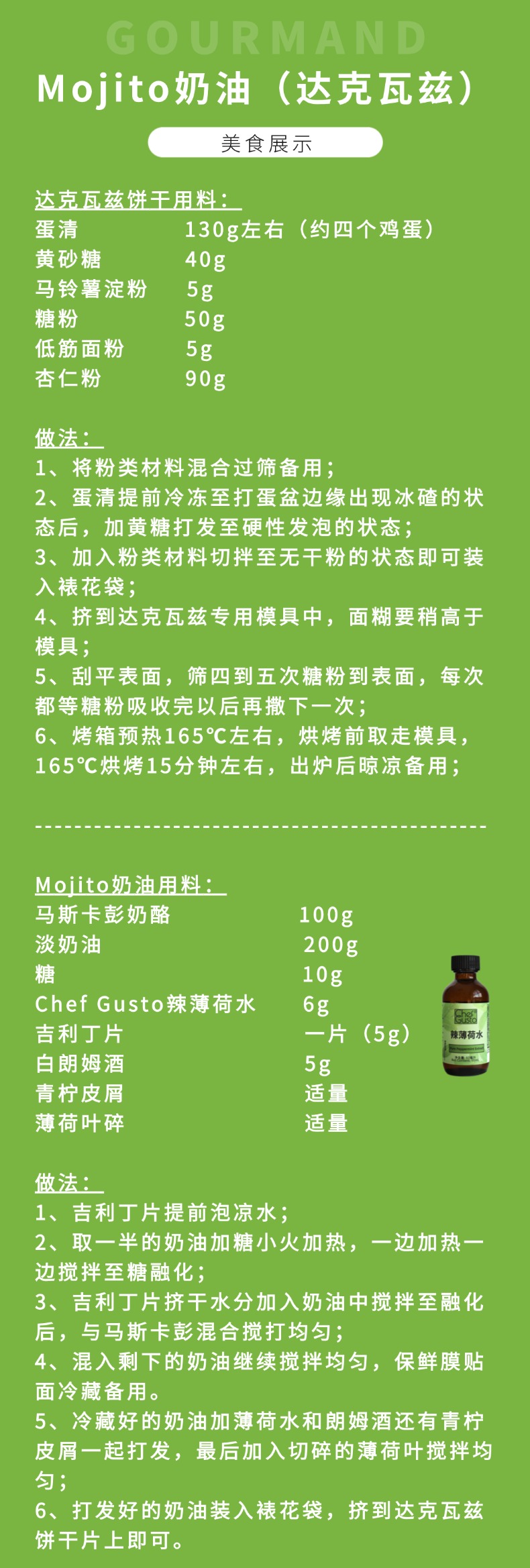 5、冷藏好的奶油加薄荷水和朗姆酒还有青柠皮屑一起打发,最后加入切碎的薄荷叶搅拌均匀;